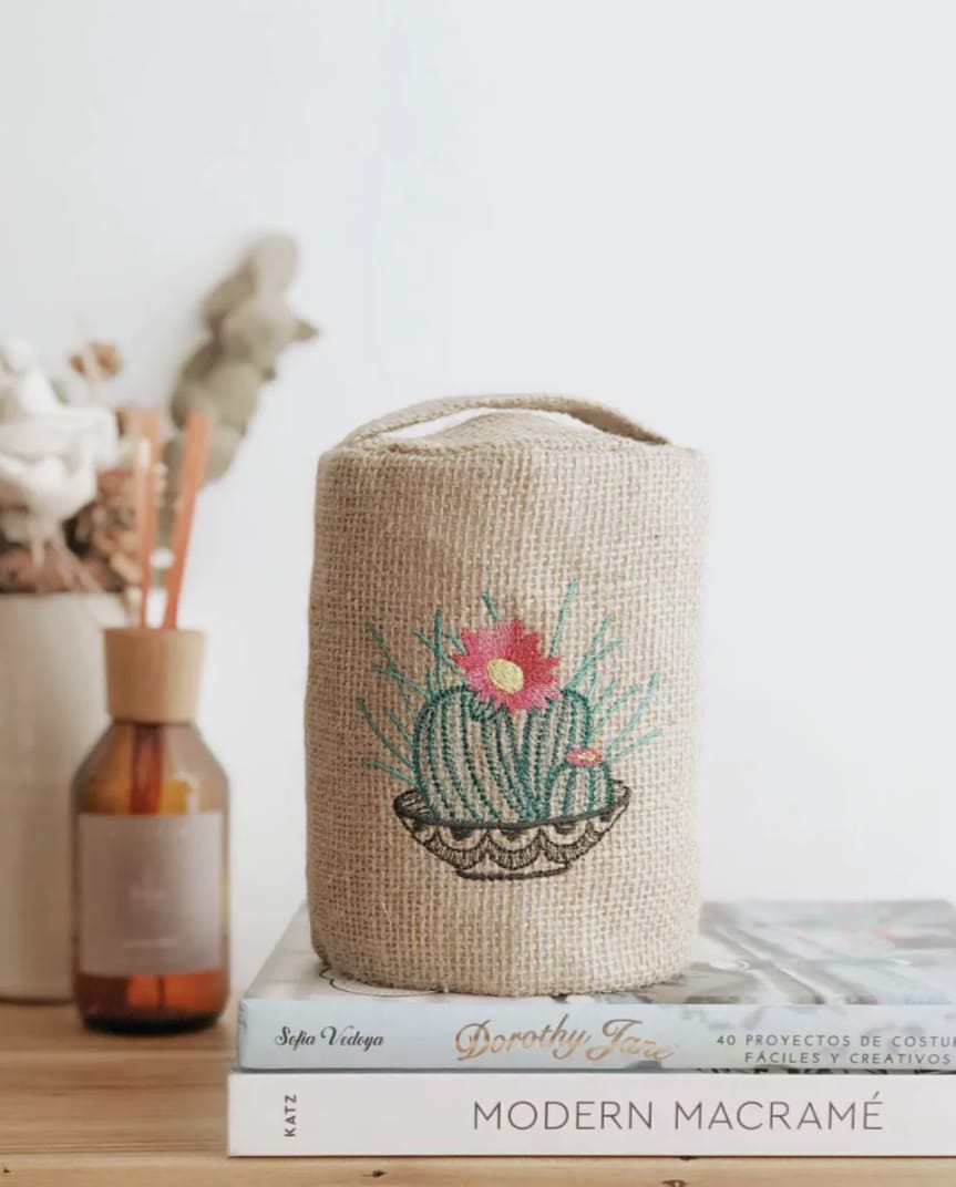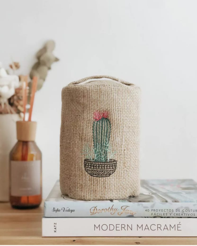 Door stop de arpillera bordada con manija para traslado.